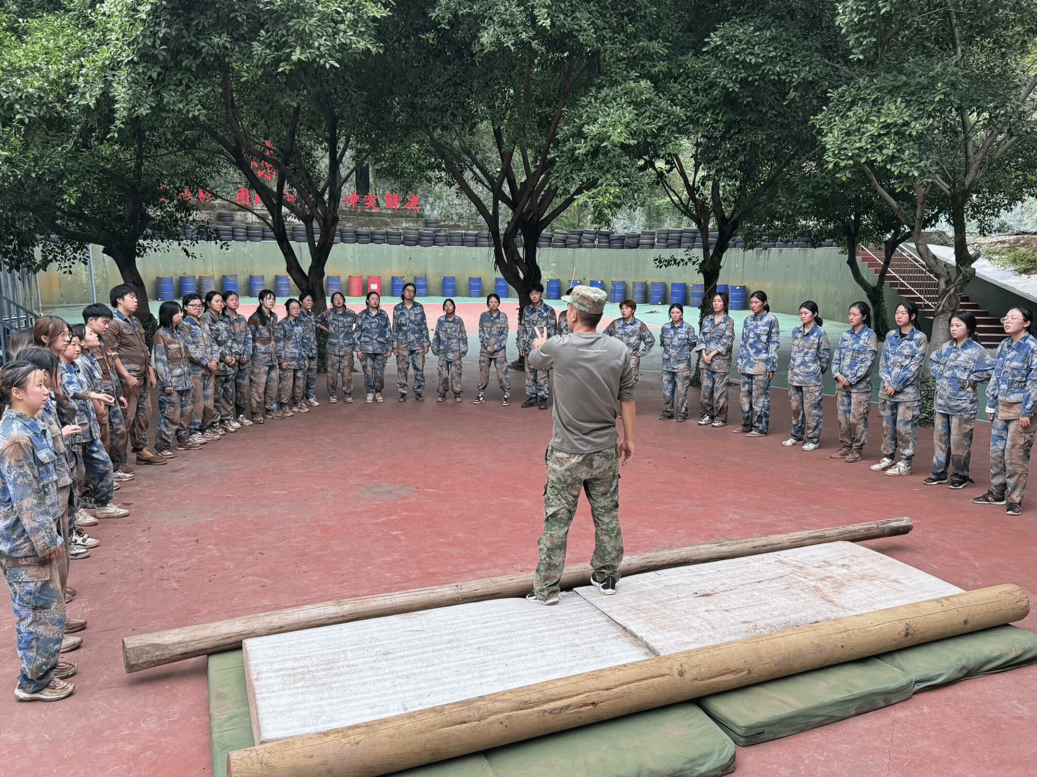 在正式开始前,我们先见到了这次的张雪如教练。知道我们是经历分流后重组的班级,为了我们彼此之间更加熟悉,张教练让我们列好队拿上她手中的微笑球通过依次传递的方式简单的介绍自己,经过这个小小的互动大家也没了刚见面时的拘谨,大声的介绍起来。随后我们见到了余青河教练,安排助教检查大家的行李物品,讲述这次淬炼课程的主要流程。接着我们又见到了田威教练,正式开启了淬炼之旅。我们先是体验了站军姿,田教练一边问我们是否了解淬炼训练课程的核心,一边时不时的拉动周围同学的手臂,是松动的话就要增加军姿时间。有同学回答到“思维创新”、“领导行为”田教练又问还有知道的吗,然而没有回答,大家都没仔细看训练基地的红色大字,但这也让我们认识到认真观察的重要。
