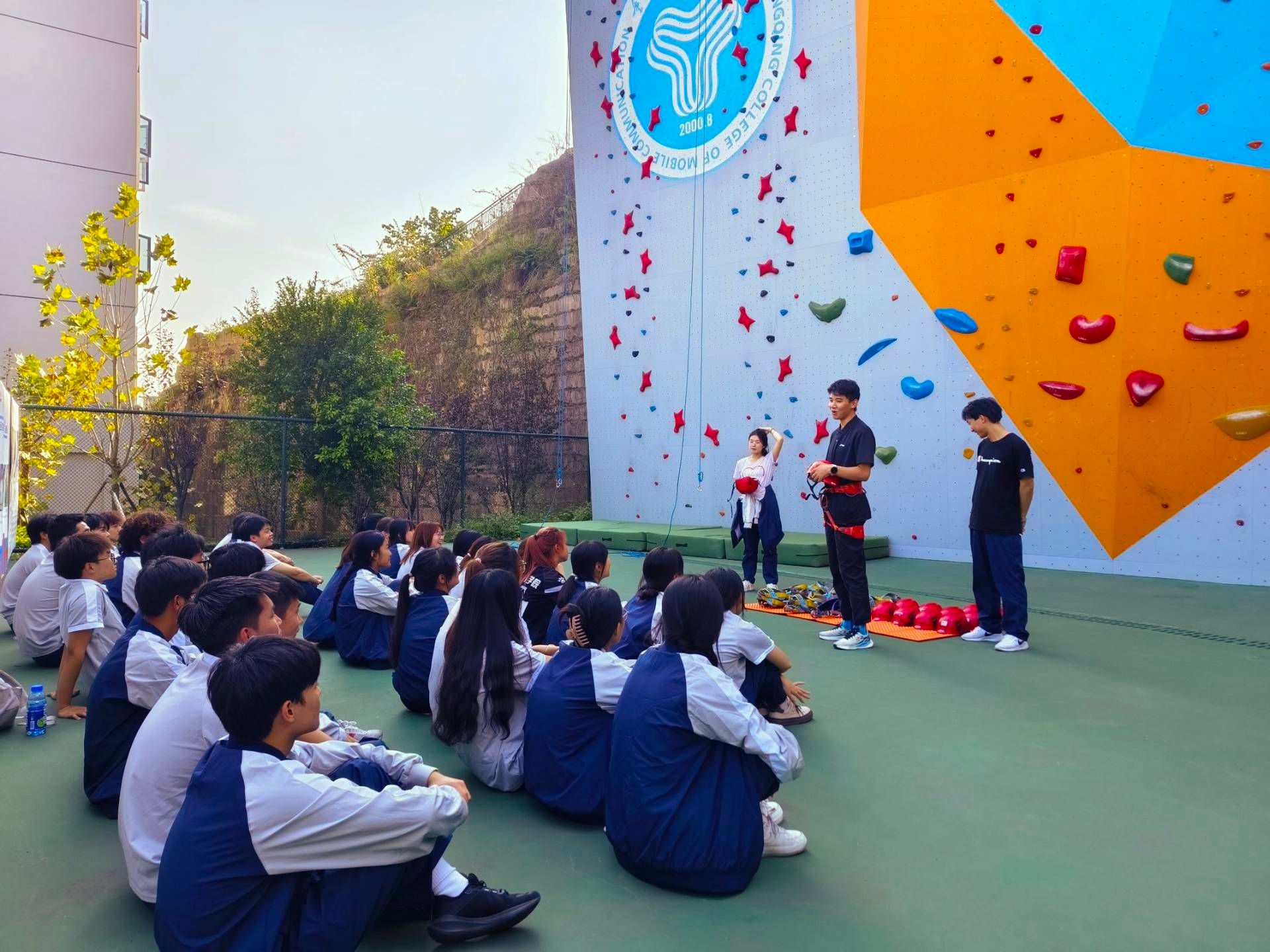 紧接着是攀岩项目,这是一项极其考验勇气和耐力的运动。在教练的指导下,同学们穿戴好安全、合格的装备,依次挑战攀岩墙。他们勇于面对、努力向上攀登,即使中途想放弃,但同学们的欢呼给予了他们无限的勇气。攀岩不仅锻炼他们的体能和意志,更让他们学会面对困难时的勇敢和坚持。