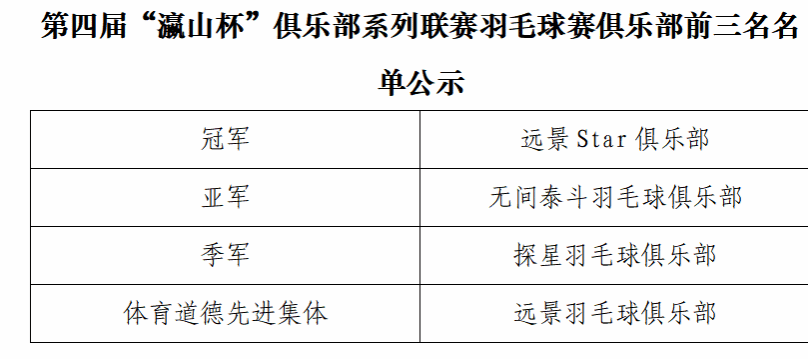 根据《完满教育委员会竞技体育学年重点工作计划》,竞技体育中心于2025年5月7日在校羽毛球场举办的第四届“瀛山杯”俱乐部系列联赛羽毛球赛现已完满收官,现将本次比赛的俱乐部的前三名进行公示。名单如下。