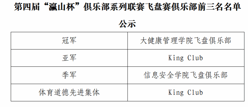 根据《完满教育委员会竞技体育学年重点工作计划》,竞技体育中心于2025年6月6日在校运动场举办的第四届“瀛山杯”俱乐部系列联赛飞盘赛现已完满收官,现将本次比赛的俱乐部的前三名进行公示。名单如下。