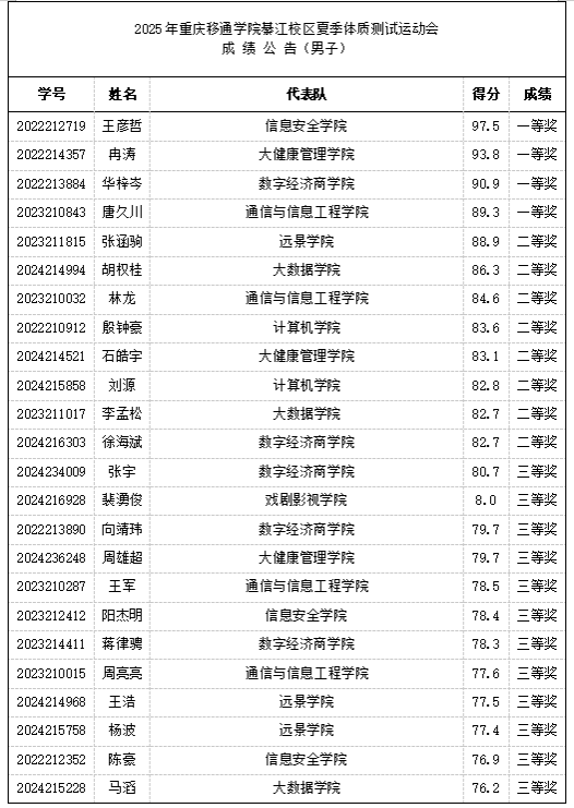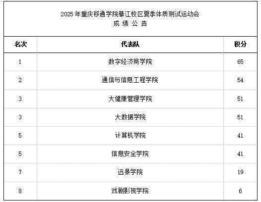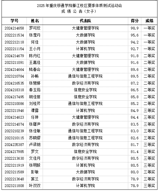 2025年重庆移通学院綦江校区夏季体质测试运动会成绩公告