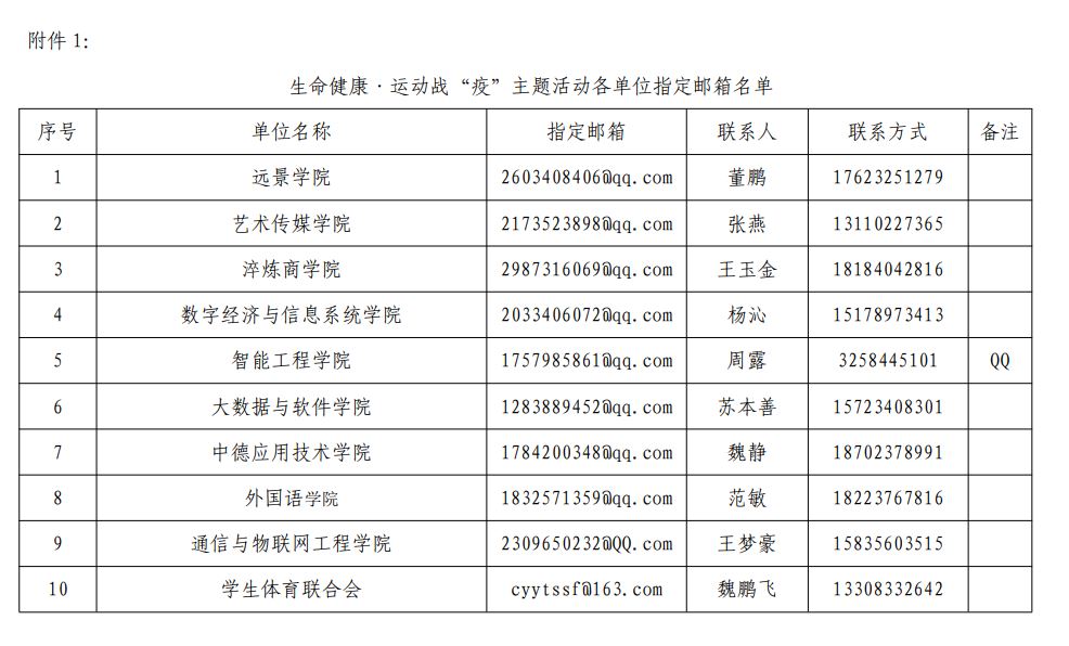 2.参与方式:编辑 1 条运动战“疫”宣言+2 张运动照片,(带 时间的 JPG、PNG 格式原图照片),以“姓名+学号+专业”成压缩包 发送至各单位邮箱,(邮箱汇总表见附件一)。