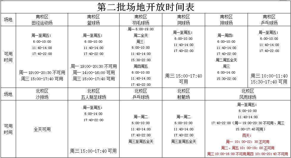 注:南校区北校区所有场地周六、周日全天可用,19日起开放全校的运动场地灯光。